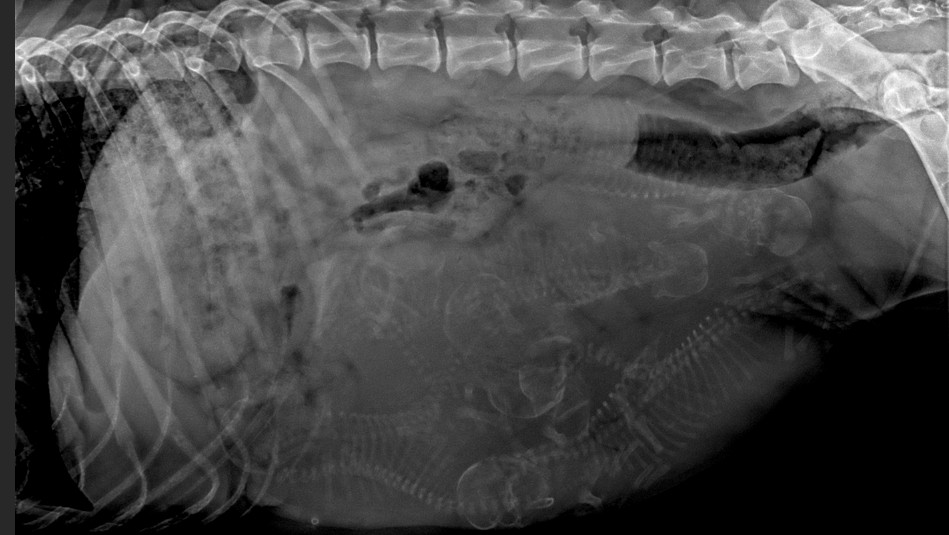 Today was XRAY Day. Have fun trying to count the puppies in here. The Vet says 4-6 but I count 7 or 8. I am guessing 7 will be the number. How about you?